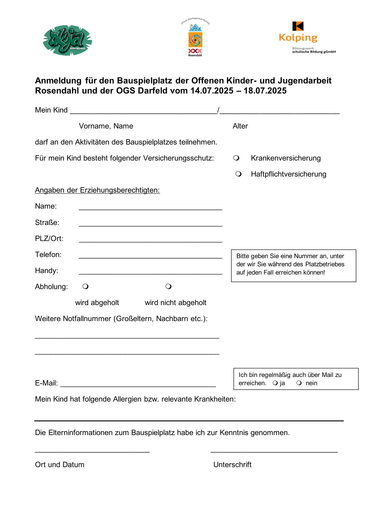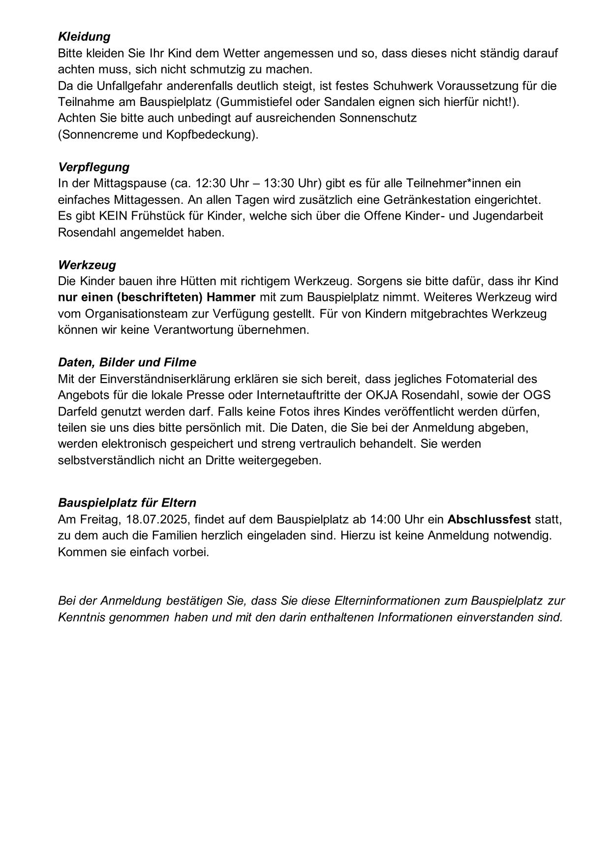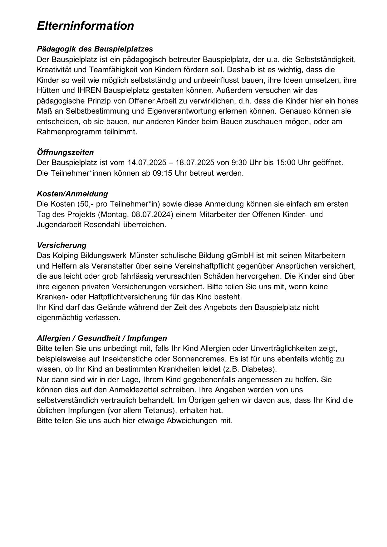 Hier findet ihr das Anmeldeformular und wichtige Hinweise zu unserem diesjährigen Bauspielplatz.