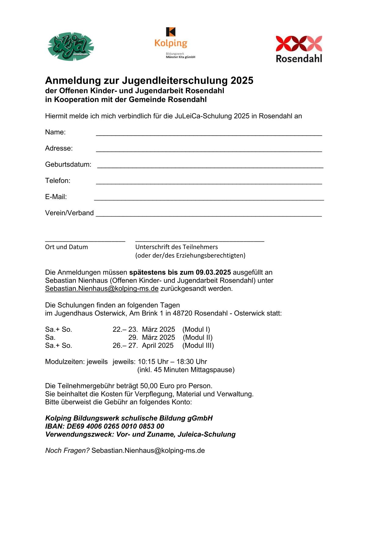 Im Jahr 2025 findet die nächste Jugendleiterschulung der Offenen Kinder-und Jugenarbeit Rosendahl statt. In Kooperation mit der Gemeinde Rosendahl und der Kolpingjugend Münster veranstalten wir eine JuLeiCa Schulung, um ehrenamtliche Helfer in der Kinder- und Jugendarbeit zu schulen. Alle wichtigen Infos findet ihr auf dem Flyer und dem Anmeldebogen.