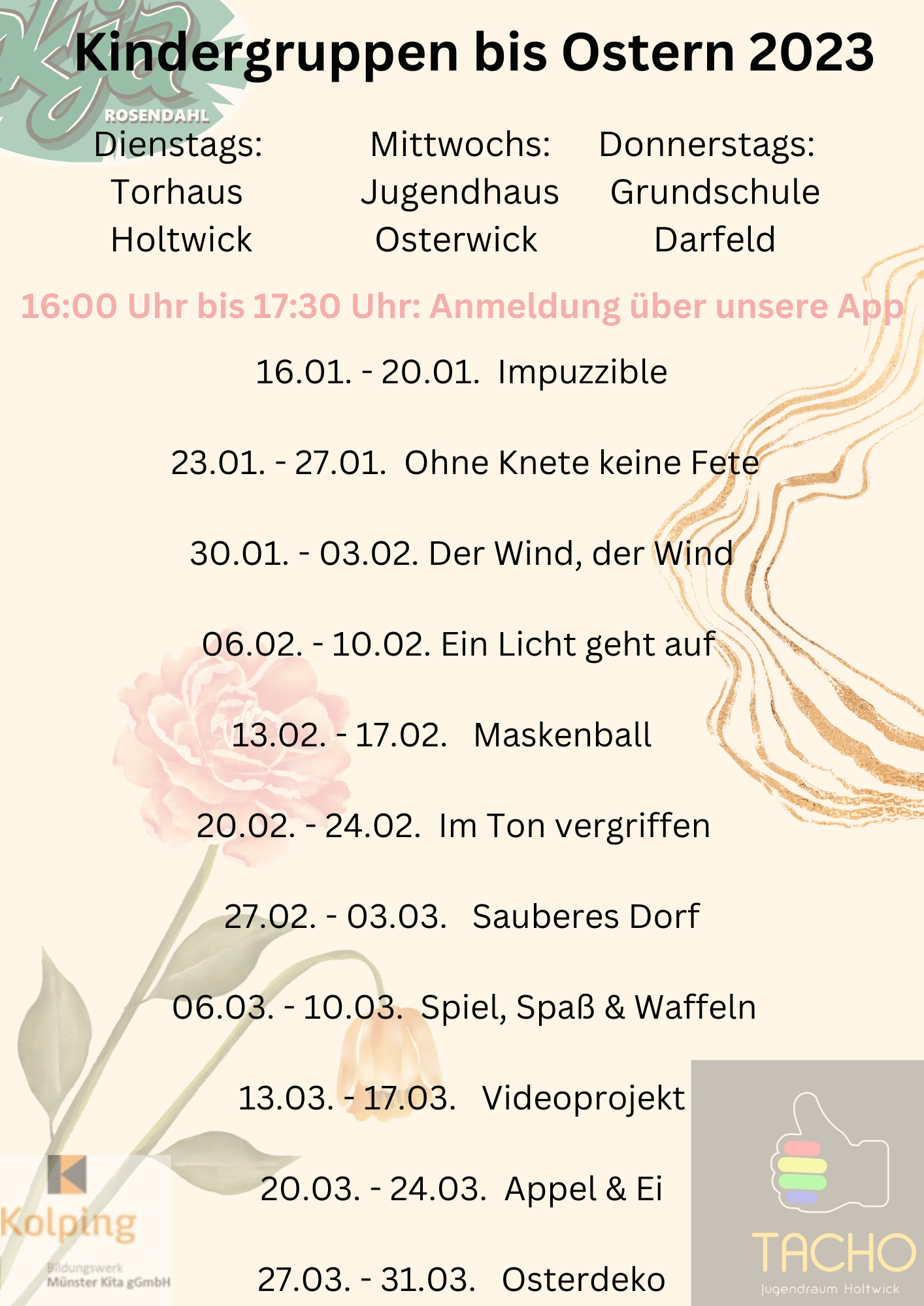 Natürlich wird es auch im Jahr 2023 wieder regelmäßige Angebote für Kinder im Alter von sechs bis zwölf Jahren geben. Die Angebote finden dienstags in Holtwick (Torhaus), mittwochs in Osterwick (Jugendhaus) und donnerstags in Darfeld (Grundschule) von 16:00 bis 17:30 Uhr statt. Die einzelnen Angebote können dem Flyer entnommen werden. Von Puzzle gestalten, über Ton formen, Videoprojekt und Appel & Ei ist für alle etwas dabei.